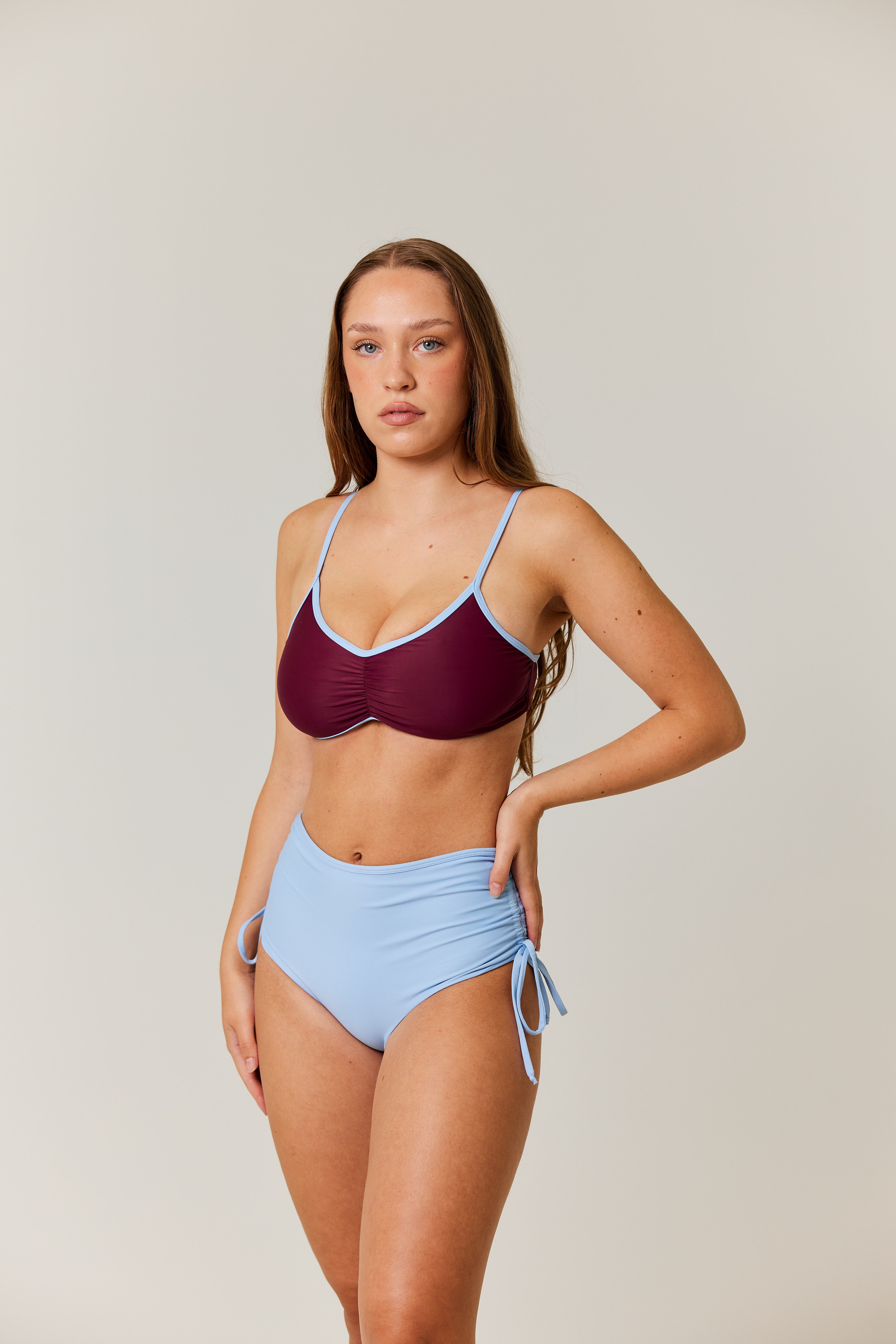 This is sleek minimalism and sophistication. The clean lines of this bikini top are complimented by contrast piping to add flair and interest. It's easy to wear, comfortable and unfussy. Suits a range of cup sizes with good coverage and shoulder straps to keep securely in place. Constructed in our signature eco-fabrication, the feel is soft and silky - a delight to wear!